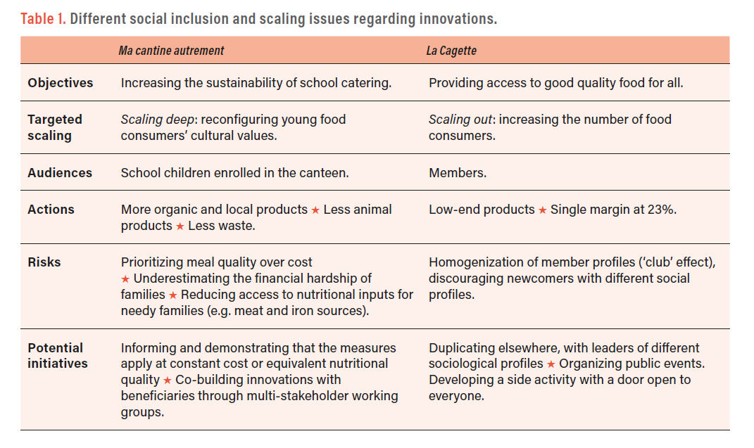 The social inclusion oriented scaling strategy differs between these two innovations. For La Cagette, the inclusion of vulnerable people is managed by recruiting a larger number of members from the initial core. For MCA, the idea is to influence the values and culture of a so-called captive audience (schoolchildren) which already includes vulnerable people. There are clearcut differences in both the values conveyed by these innovations and the mecha-nisms that operationalize them.