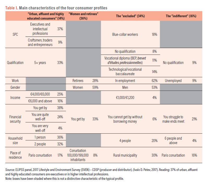 – All the consumers surveyed fit one of four typical profiles, the comparison of which shows that sustainable food practices are strongly shaped by social position, level of education, employment status, and gender.