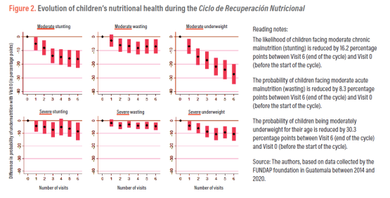 The analyses conducted show that the nutritional health status of children under five improves when they complete a full cycle. Three anthropometric indicators were measured: stunting (chronic malnu-trition or low height for the child’s age), wasting (acute malnutrition or low weight for the child’s height), and underweight (the combination of the first two indicators or low weight for the child’s age), distinguishing between moderate and severe health conditions for each indicator. Figure 2 shows the probability of a child facing one of these three conditions of poor nutritional health at each visit, compared to the initial visit (Visit 0). We can observe that this probability decreases with each visit across all three types of undernutrition.