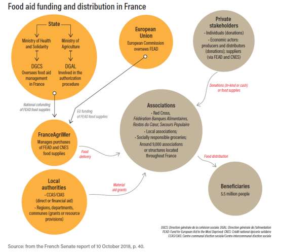 The food aid system hinges on this ’man in the street’ depiction of food precarity. Since the 1980s, the French government has been involved in organizing this aid by financing part of the food supply of charitable associations (Paturel, 2013; Retière and Le Crom, 2018). The focus has been on the distribution of food, especially that from European stocks generated by Common Agricultural Policy (CAP) production-support schemes. Food aid distribution has been extended to include low-income families receiving welfare benefits. This has led to the structuring of an economic sector whereby the organization of agricultural production and agrifood industry stakeholders and distributors are supported by direct and indirect French and European Union (EU) subsidies.