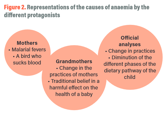 Understanding the causes attributed to anaemia seems to be a key factor in being able to combat malnutrition. In fact, it is necessary to propose solutions which are appropriate for beliefs transmitted from generation to generation in the population, bearing in mind the recommendations of official authorities who have difficulties in understanding how to have an impact on the practices.