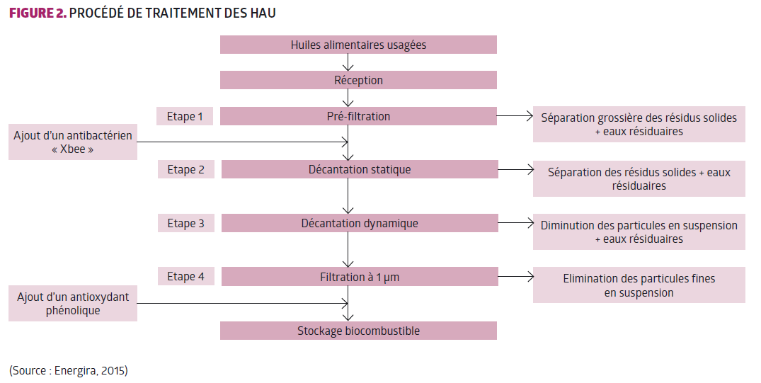 Les HAU collectées par les grands groupes sont en majorité intégrées dans la filière agrocarburants, au sein de laquelle elles sont mélangées à des huiles végétales pures puis transformées en biodiesel par procédé de transestérification. Ce biodiesel est incorporé à hauteur de 7 % dans le diesel que trouve le consommateur. Ce combustible possède donc un impact environnemental fort pour un faible rendement énergétique, de l’ordre de 30 à 40 % dans un moteur de voiture (le reste étant dissipé sous forme de chaleur).