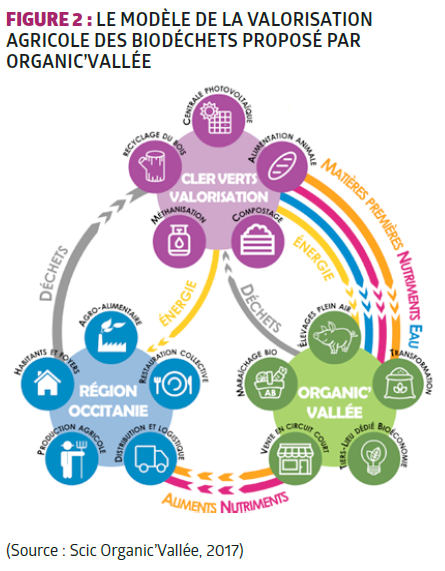→ une boucle entre les occupants agricoles d’Organic’Vallée et la région Occitanie (plus précisément l’aire urbaine de Toulouse) : Cler Verts collecte une partie des biodéchets des gros producteurs et des collectivités de l’aire urbaine, les traite et restitue un compost utilisable en agriculture biologique ou de l’énergie par méthanisation.