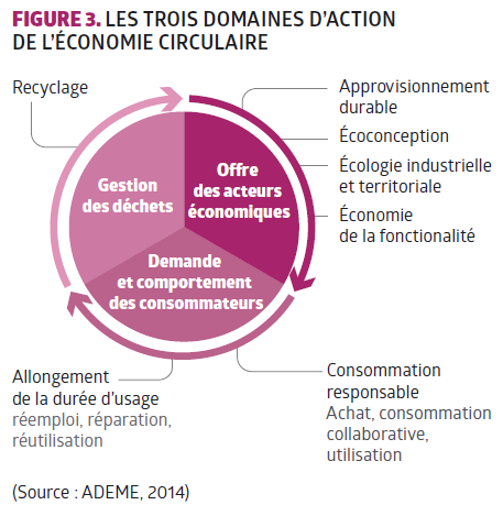 Le concept d’économie circulaire ne connaît pas de définition établie, mais nous retiendrons la définition de l’ADEME avec ses trois domaines d’action et ses sept piliers [Figure 3].