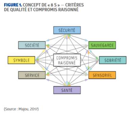 La production de denrées alimentaires doit respecter des normes et réglementations liées à l’hygiène, à l’analyse des risques alimentaires, à l’emballage, sans compter le respect de référentiels spécifiques de sécurité sanitaire imposés par certains distributeurs (comme l’International Featured Standard ou IFS et le British Retail Consortium ou BRC). Les entreprises doivent aussi répondre aux besoins des consommateurs, qui réclament des produits alimentaires sains, les moins transformés possible et plus respectueux de l’environnement, sans oublier la question du prix [1] . Pour Didier Majou, directeur de l’Association des centres techniques de l’industrie alimentaire (ACTIA), la création d’un produit alimentaire est un « compromis raisonné » entre les « 8 S », comme illustré dans la figure 1.