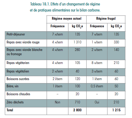 L’Agence française de la transition écologique (Ademe) fournit un calculateur permettant de simuler l’effet de changements de consommation sur leur impact carbone. Pour rappel, l’empreinte carbone de la consommation des Français est d’environ 9,8 tonnes CO2e" class="/pers/an (dont 2,8 tonnes pour l’alimentation, 2,8 tonnes pour le transport et 2,1 tonnes pour le logement). L’objectif à atteindre pour rester dans la limite d’un réchauffement inférieur à 2 °C en 2100 est de parvenir à une empreinte d’environ 2 tonnes de CO2e/pers/an, soit une réduction d’environ 8 tonnes. Le tableau suivant montre les effets d’un changement de régime et de pratiques alimentaires sur le bilan carbone.