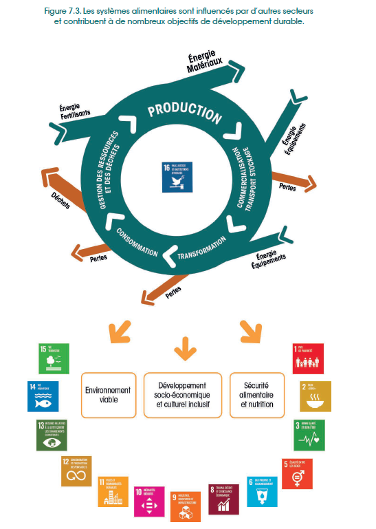 Les modèles de développement issus des pays les plus industrialisés, et diffusés partout dans le monde par le biais d’investissements privés et, en partie, par la coopération internationale, sont aujourd’hui contestés. Conscients des nouveaux risques générés par ces modèles de développement, les 193 pays membres des Nations unies se sont fixés, en 2015, 17 Objectifs dits « de développement durable » (ODD). À la différence des Objectifs du Millénaire pour le développement (OMD) des quinze années précédentes qui ne concernaient que les PED, les ODD concernent tous les pays du monde, y compris les plus riches et industrialisés. En examinant chacun de ces objectifs, on constate que les systèmes alimentaires, qu’ils soient ou non à l’origine des enjeux identifiés, sont concernés par la majorité d’entre eux et peuvent y contribuer (figure 7.3). La finalité des systèmes alimentaires ne peut dès lors plus seulement être de nourrir les êtres humains, ce qu’ils font en maximisant la production alimentaire avec le succès qu’on connaît. Ils doivent désormais se donner au moins deux autres ambitions : contribuer activement à la viabilité de la biosphère et participer à un développement socio-économique et culturel inclusif et équitable.