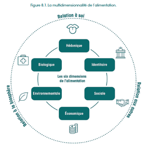 Cette proposition d’une « écologie de l’alimentation » vise ainsi à partager une nouvelle grille de lecture pour penser l’alimentation (figure 8.2.). C’est un plaidoyer scientifique pour la mise en lien de ses différentes dimensions et pour l’engagement dans la transformation des systèmes alimentaires. Une écologie de l’alimentation vise à nourrir la réflexion des chercheurs et des étudiants, mais peut aussi inspirer les acteurs du système alimentaire ou un grand public averti et curieux des enjeux d’alimentation durable. Elle ne cherche pas à définir un cadre normatif ou de prescriptions sur les « bonnes pratiques » de l’alimentation durable. Il nous semble justement que l’alimentation nécessite d’être pensée en contexte pour tirer parti, au mieux, de la situation considérée. Une écologie de l’alimentation s’apparente plutôt à une « école de pensée » qui reflète un regard porté sur la complexité de l’alimentation et de ses enjeux contemporains, celui de la Chaire Unesco Alimentations du monde, mûri au cours des dix années de dialogues entre sciences et sociétés sur l’alimentation durable. Les deux chapitres suivants détailleront respectivement les deux propositions qui sous-tendent une écologie de l’alimentation : décloisonner les savoirs sur l’alimentation et s’engager politiquement pour la transformation des systèmes alimentaires. Les conséquences pratiques de ces deux propositions seront présentées dans les parties 4 et 5.