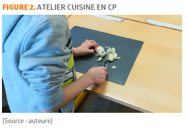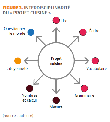 Les apprentissages scolaires constituent un atout essentiel qui fonctionne dans les deux sens. Les activités des ateliers, réinvesties en classe, donnent du sens aux apprentissages et les renforcent : lecture, grammaire, vocabulaire (culinaire, botanique), mathématiques (mesures de masses, de volumes, proportionnalité, etc.), découverte du monde, etc., sont mieux appropriés par les élèves. L’implication de l’enseignant dans la préparation et le suivi des ateliers est un facteur clé de réussite. Le cadre de l’école primaire, où un seul – voire deux – enseignant construit le projet pour la classe et met en lien les enseignements, est favorable (Figure 3).
