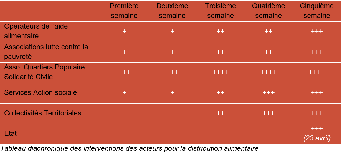 La crise a montré le manque de souplesse des services publics quant à leur réactivité : il aura fallu une bonne quinzaine de jours avant que ceux- ci soient en capacité de trouver une organisation capable de faire face aux besoins alimentaires de la population. Il en est de même pour les associations institutionnelles. En outre, les interventions se sont mises en place de façon très différentes en fonction de la réalité des forces au niveau local et micro-local : ici c’est le Secours populaire, là c’est la banque alimentaire, et ailleurs les Restos du Cœur. Les associations confessionnelles ont également pris place dans les divers partenariats comme Muslihands à Lyon, ou le Secours Catholique dans beaucoup de communes, y compris l’armée comme par exemple à Belfort, en renfort des Restos du Cœur.