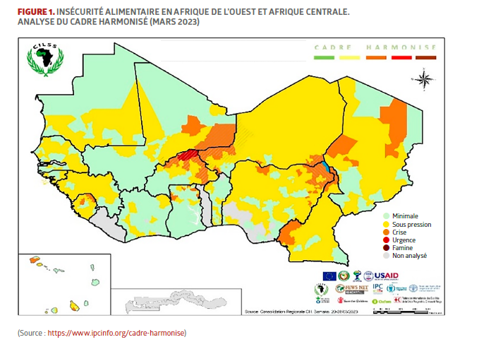 Dans les pays historiquement considérés comme fragiles vis-à-vis des questions de faim et de précarité alimentaire, l’utilisation d’outils d’analyse pour identifier les risques d’insécurité alimentaire s’est institutionalisée durant les dernières décennies. D’importants efforts d’enquête ont été faits pour analyser, anticiper et cartographier les risques et les vulnérabilités à l’insécurité alimentaire. À titre d’exemple, dans les pays sahéliens et en Afrique de l’Ouest, les analyses du « cadre harmonisé » sont des méta-analyses de l’insécurité alimentaire et nutritionnelle basées sur quatre dimensions : consommation alimentaire, moyens d’existence, nutrition et mortalité. Ces analyses permettent de cartographier l’insécurité alimentaire et nutritionnelle aiguë (Figure 1).