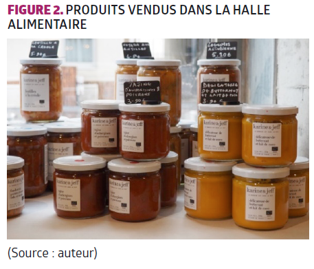 Food2rue est convaincue de la nécessité de s’orienter vers des modèles d’alimentation durables et accessibles à tous. L’association a justement remporté l’appel à projet de la Ville de Paris pour l’implantation d’une halle destinée à la promotion de l’alimentation durable (« La Panaméenne », dans le 14e arrondissement), dans laquelle elle est donc implantée depuis février 2018 [3] [Figure 1]. Food2rue est donc maintenant en charge de la vente de produits alimentaires qui doivent permettre de soutenir une agriculture locale et durable et privilégient les circuits courts (par exemple, produits issus de l’agriculture biologique ou produits par des « Parisculteurs ») [Figure 2], de la vente à emporter, et de la sensibilisation du grand public, avec la mise en place d’ateliers de cuisine et d’animations culturelles (projections sur des thèmes d’alimentation durable, par exemple).