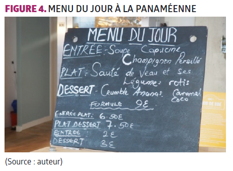 La cuisine proposée à Food2rue est internationale puisqu’elle s’inspire des nationalités qu’elle accueille [Figure 4]. L’élaboration des recettes est réalisée par l’encadrante technique, au regard des capacités d’approvisionnement de l’association mais aussi de la saisonnalité des produits et des capacités techniques de chaque femme. Au fur et à mesure que les salariées acquièrent de l’expérience et de l’assurance, elles peuvent devenir à leur tour forces de propositions et participer à l’élaboration des recettes. Les premiers mois au sein du chantier d’insertion permettent de prendre la mesure de l’outil de travail, d’apprendre le respect des quantités et des temps de préparation, pour une pleine appropriation de l’espace de cuisine.