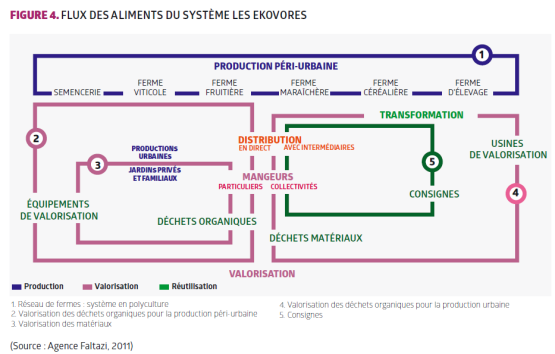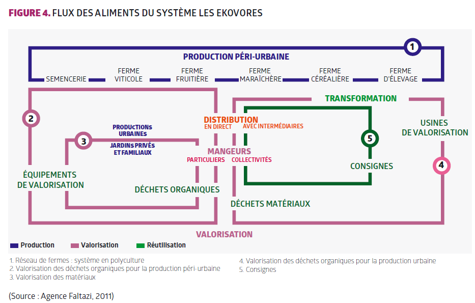 Dans ce système, les aliments pourraient être produits dans les campagnes péri-urbaines, transportés de manière propre vers les villes où ils seraient distribués aux mangeurs et aux collectivités. Les produits pourraient être transformés et les pertes et déchets valorisés. Les déchets orga-niques valorisés (compost, urine transformée) pourraient être ensuite réutilisés comme fertilisants en agriculture dans les campagnes, dans les potagers de villes ou dans les jardins et espaces verts.