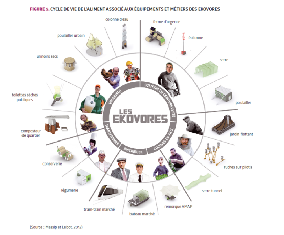 Ces éléments urbains ont été pensés comme des « enzymes » pouvant faciliter et accélérer la mise en œuvre d’un système alimentaire durable. Dans ce système de type économie circulaire, les relations entre mangeurs et producteurs sont renforcées, les déchets deviennent des ressources, les distances parcourues se raccourcissent. Un système moins polluant est construit, au sein duquel le mangeur se responsabilise et peut reprendre son alimentation en main pour la rendre plus saine grâce aux éléments urbains mis à disposition. Ce mode d’alimentation de la ville n’exclut pas pour autant les échanges avec l’extérieur, mais est pensé pour améliorer la résilience d’une collectivité, replacer les habitants au cœur du système et valoriser les déchets alimentaires en ressources. Tel qu’il a été pensé, il permet aussi de créer de nouveaux métiers qui prennent en charge une partie du fonctionnement de ce cycle, comme des « maîtres composteurs » et « AMAPeurs » par exemple.