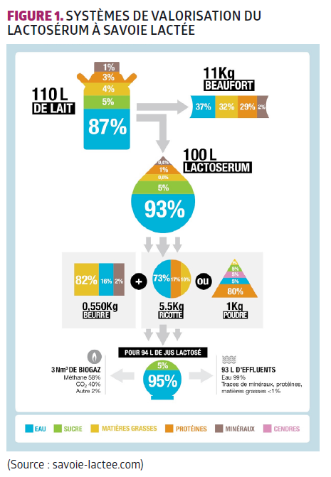 Après une réflexion qui avait débuté en 2009, l’UPB a fait le choix de construire à Albertville, en Savoie, sa propre unité de valorisation du lactosérum : Savoie Lactée. L’usine, qui est opérationnelle depuis l’été 2015, traite jusqu’à 200 000 litres de lactosérum par jour, apportés directement par les sept coopératives de la zone de Beaufort et les coopératives de Yenne et des Entremonts en Chartreuse qui fabriquent de la Tomme de Savoie IGP et qui ont rejoint le projet à sa création. L’usine regroupe trois ateliers de valorisation du coproduit : une beurrerie collective qui transforme la matière grasse du lactosérum en beurre de baratte (270 tonnes / an), un atelier qui transforme le petit-lait en ricotte (« ricotta » en italien, 40 tonnes/an), utilisée par les industriels pour réaliser des préparations légères et digestes, et une unité de déshydratation qui permet de produire de la poudre de protéines de lactosérum (450-500 tonnes/an) de haute qualité nutritionnelle, appelée WPC 80 (qui contient au minimum 80 % de protéines sur matière sèche). Les effluents produits par ces trois ateliers, ainsi que les eaux de lavage, vont ensuite alimenter une unité de méthanisation ultra performante qui va produire du biogaz, qui sera ensuite transformé par un cogénérateur en chaleur (3 500 MWh/an) et en électricité (3 000 MWh/an) revendue à un tarif préférentiel à EDF. L’usine fournit ainsi de l’électricité à mille cinq cents personnes par an et produit de l’eau chaude utile pour le fonctionne-ment des ateliers. Enfin, une technologie brevetée de méthanisation, développée par la société d’ingénierie environnementale Valbio, permet à Savoie Lactée d’épurer 99 % de ses résidus. Ces derniers vont être soit rejetés dans le milieu naturel, l’Isère, sous forme d’eau épurée, soit utilisés sous forme de boues biologiques destinées à la fertilisation des paysages savoyards [Figure 1]. C’est en tout quatre dispositifs qui ont ainsi été imaginés par les professionnels de la filière de Beaufort pour la valorisation de leur lactosérum.