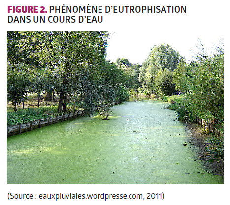 La valorisation du lactosérum représente aussi un enjeu de taille pour l’environnement. En effet, autrefois éliminé par épandage ou rejeté à proximité d’un cours d’eau de montagne, celui-ci était à l’origine d’une pollution grave due à la fermentation des matières organiques. Fiaux (2004) a ainsi montré qu’un litre de lactosérum équivaut environ à la charge polluante rejetée chaque jour par un habitant ou un équivalent habitant [1] (EH). Le lactosérum est fortement chargé en matière organique et en phosphore. Lorsqu’il est rejeté dans l’environnement comme dans le cas d’un lac, où la masse d’eau se renouvelle lentement, il va renforcer l’anaérobiose du milieu et va aussi représenter une nuisance olfactive pour le voisinage. Ce phénomène se nomme l’eutrophisation [Figure 2].