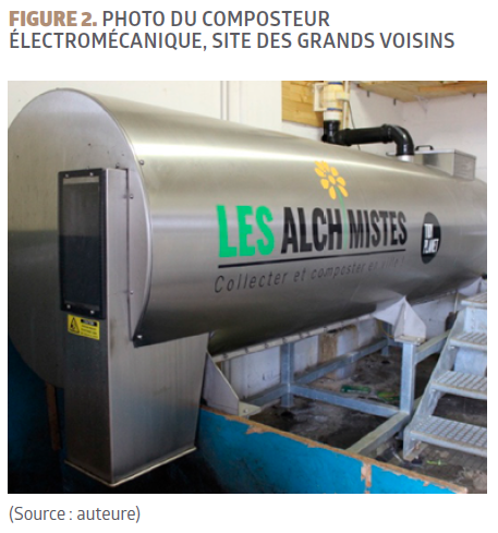 Pour y parvenir, les Alchimistes se sont pré-occupés de la norme ICPE, qui comprend un ensemble de règles strictes réservées aux « installations classées pour la protection de l’environnement ». Les sites de traitement dépassant le seuil de 2 tonnes de déchets traités par jour sont compris dans cette catégorie. Pour échapper à ces règles, les experts composteurs ont donc cantonné la quantité de déchets collectée en dessous des 2 tonnes journalières. Ils évitent, entre autres, d’être concernés par la nécessité d’une distance minimale de 250 mètres entre le site de traite-ment et les zones d’habitation alentour. Ainsi, situé aux Grands Voisins, le plus petit des sites des Alchimistes réceptionne jusqu’à 150 kg de déchets par jour, soit environ 30 tonnes par an. Celui de La Caverne, équipé de deux petits composteurs, peut, quant à lui, en traiter le double. Finalement, le plus gros site, installé à l’Île-Saint-Denis, permet de transformer 1,7 tonne de déchets journaliers, soit une moyenne de 600 tonnes à l’année (Figure 3).