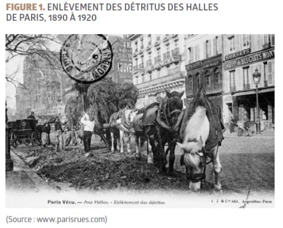 Les déchets furent alors ramassés quotidiennement avant d’être emmenés aux frontières de la ville (Figure 1). Les chiffonniers et ferrailleurs s’attelaient au tri, ne laissant que déchets orga-niques et boues qui, successivement, se transformaient en compost avant de servir d’agrément aux sols alentour. Plus de 10 000 m3 profitaient ainsi à l’agriculture urbaine, transformant la terre de Paris en sol à haute valeur agronomique. La valorisation de déchets était ainsi entraînée par une première forme, peu officielle, d’économie circulaire. Un modèle qui laissa progressivement place à d’autres, notamment à l’incinération, très vite apparue comme le moyen le plus efficient de traiter les quantités croissantes de déchets (Barbier, 1997).