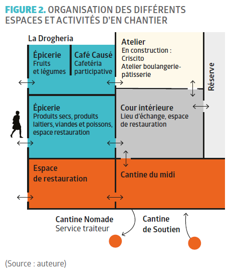 En lien avec ses adhérents, En Chantier ne cesse de réfléchir à de nouvelles activités (Figure 2). Le Café Causé, lieu d’échange sous forme de cafétéria participative, est actuellement en construction. Ce projet part d’une situation qui existe déjà mais de façon informelle : l’accueil des personnes dans les locaux de l’association et leur accompagnement selon leurs besoins (orientation professionnelle, accompagnement pour accès aux droits sociaux, etc.). L’idée du Café Causé est donc « de donner plutôt un espace visible [à cet accueil informel], qui est l’espace café, la porte d’entrée où l’on peut accueillir les personnes, les orienter sur les différentes activités et leur proposer d’être moteur dans des propositions d’ateliers, etc. » explique Sarah Toumi, salariée de l’association et coordinatrice de ce projet (Toumi, 2021). Ce projet est en lien avec celui de l’atelier Criscito, un atelier de boulangerie-pâtisserie qui a déjà connu une première phase d’expérimentation en 2019, et dont les objectifs sont d’élargir encore les possibilités d’échange et de partage autour de l’alimentation, mais aussi de permettre la mise en place de chantiers d’insertion professionnelle.