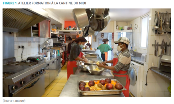 Tous les midis, des bénévoles préparent des repas à la Cantine du midi, le restaurant participatif de l’association. Ils sont réalisés sous forme « d’ateliers-formations » et animés par un salarié ou un stagiaire de l’association (Figure 1). Les menus sont ensuite vendus aux adhérents de l’association, à un prix accessible de huit euros le menu. La cuisine sert de tremplin pour améliorer les connaissances des bénévoles dans le champ de la nutrition et de l’alimentation mais c’est aussi un outil de transformation sociale grâce à la dynamique participative qui y est soutenue. Chacun est libre de proposer les plats qu’il souhaite faire découvrir, les menus sont co-élaborés selon les envies des participants. C’est aussi un espace de dialogue et de partage à travers les pratiques culinaires de chacun et les transmissions de savoir-faire.