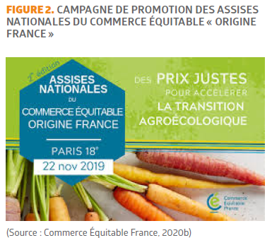 Le 22 novembre 2019 avaient lieu les 2e assises nationales du commerce équitable « origine France » (Figure 2). Lors de cette journée, des discussions ont été menées afin d’établir des recom-mandations destinées aux pouvoirs publics. Ces derniers devraient informer et sensibiliser les consommateurs (1er levier). Les membres de CEF proposent une stratégie nationale d’éducation à la consommation responsable et équitable, mise en œuvre par l’État. Ils proposent également qu’il soit obligatoire de passer par un label pour se prévaloir du commerce équitable (Commerce Équitable France, 2020b).