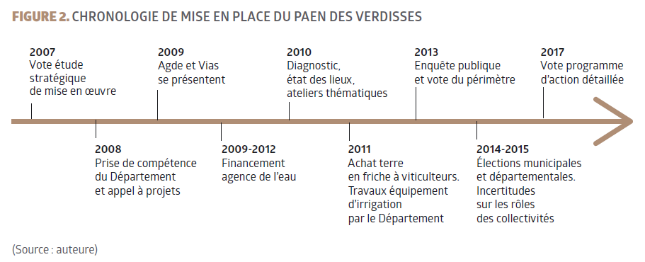 La communauté d’agglomération Hérault Méditerranée (CAHM), sensibilisée par les questions agricoles, et les villes de Vias et d’Agde, ont identifié le PAEN comme un outil permet-tant de répondre à leur problématique spécifique sur le territoire des Verdisses. L’appel à projets a généré un financement de l’agence de l’eau sur 3 ans (2009-2012) avant même la signature du périmètre (voir chronologie du projet en figure 2), générant un grand élan d’équipement d’irrigation sur une grande partie du territoire. Des études de diagnostic agricole menées par des associations environnementalistes (Écologistes de l’Euzière), ainsi que la chambre d’agriculture ont peu à peu amené à l’identification aujourd’hui de huit sous-secteurs (Figure 3) distribués en trois catégories : secteur agricole, secteur des prairies humides et Clos de Vias, la seule zone naturelle du périmètre.