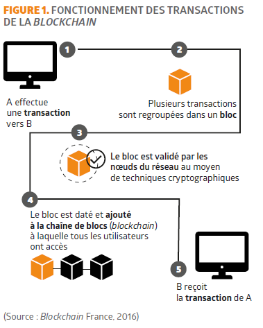 La blockchain ou « chaîne de blocs » est une nouvelle technologie qui fonctionne comme une grande base de données de stockage et de traitement de l’information de manière totalement transparente et sécurisée. Cette base de données se compose d’une multitude de petits blocs auxquels sont rattachées des informations spécifiques. Plus précisément, il s’agit d’un réseau distribué dans lequel chaque information intégrée doit être validée par les membres du réseau lors de chaque transfert dans des blocs (Figure 1).