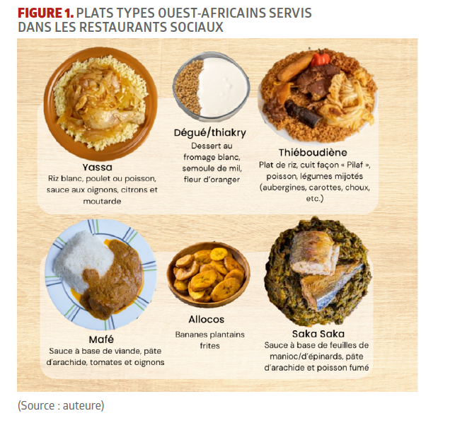 Aujourd’hui, il existe huit restaurants sociaux actifs en ACI répartis sur Paris et sa banlieue. On retrouve dans tous ces restaurants des plats ouest-africains et respectant la norme halal, déjà proposés dans les cantines informelles, comme le yassa, le thiéboudiène, le mafé, etc. (Figure 1). Grâce à l’initiative d’APPUI, ces huit structures sont également membres d’un réseau d’entraide et de partage qui se nomme « Resto-passerelle ». Cette plateforme leur permet notamment de négocier auprès de fournisseurs et grossistes communs les prix des matières premières, coûteuses pour certaines, vu leur origine exotique.