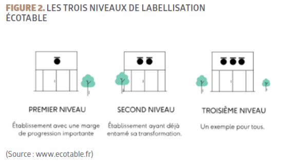 Les trois niveaux de labellisation sont déclinés comme suit, en fonction du niveau d’engagement du restaurateur dans une démarche durable :