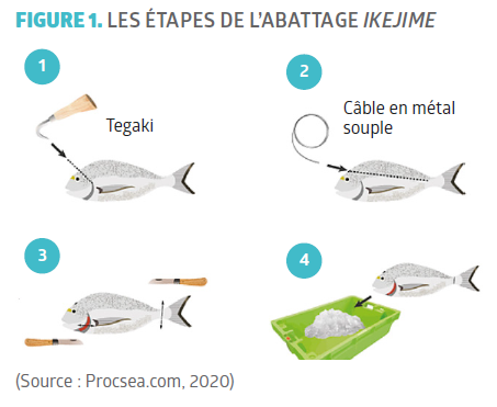 Le poisson ikejime est un poisson abattu selon une technique japonaise séculaire, il est ensuite mis à maturer durant plusieurs jours. Ce processus permet d’obtenir une chair extrêmement tendre et de conserver le poisson jusqu’à vingt jours au frais. Au Japon, où la majorité des poissons de qualité est abattue en ikejime, la méthode serait née d’une vision bouddhiste de la mort donnée à l’animal. Il doit souffrir le moins possible et être valorisé le mieux possible. Joseph Melin, reporter ayant accompagné un jeune marin-pêcheur basé à Quiberon qui pratique la méthode ikejime, la définit ainsi : « Moins cruelle, moins douloureuse et moins stressante, la méthode ikejime consiste à tuer instantanément le poisson et à neutraliser son système nerveux le long de la colonne vertébrale. Les influx nerveux ne passent plus à la chair, qui ne reçoit pas l’information de la mort. L’inéluctable processus naturel de dégradation est considérablement retardé. (…) La chair d’un poisson ikejime se conserve mieux et est supérieure gustativement » (Melin, 2020). La figure 1 détaille les différentes étapes de l’abattage ikejime et présente les outils utilisés.