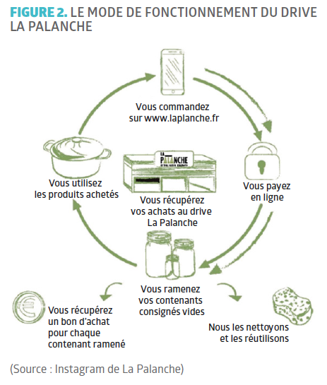 Le drive « zéro déchet » La Palanche fonctionne comme un drive de grande surface classique. Les clients font leur commande sur le site Internet puis choisissent un créneau horaire et le lieu où ils souhaiteront récupérer leur commande. Ils ont le choix entre l’entrepôt de Saint-Gély-du-Fesc ou deux lieux de retrait situés dans le nord de Montpellier, le mardi et le vendredi en soirée. Les clients profitent de leur passage pour rendre les bocaux et les cagettes consignés. Chaque bocal ramené permet au client de recevoir un avoir de 10 centimes pouvant être utilisé lors de la prochaine commande : ce système s’appelle la consigne inversée (Figure 2). Ce principe permet de rendre la consigne gratuite contrairement à sa version classique. En effet, dans le cas de la consigne classique, le consommateur doit payer une somme d’argent supplémentaire pour chaque achat d’un produit consigné, somme qui lui sera retournée lorsqu’il rapportera l’emballage vide. Dans le cas d’un drive « zéro déchet », cette avance d’argent peut devenir importante et constituer un frein économique pour certains clients. C’est pour répondre à cette limite que La Palanche a mis en place ce principe de consigne inversée.