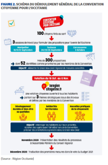 La convention citoyenne pour le climat (CCC), qui s’est déroulée entre 2019 et 2020, a rassemblé 150 citoyens français tirés au sort dans l’objectif de définir des mesures permettant de diminuer d’au moins 40 % les émissions de gaz à effet de serre d’ici 2030 par rapport à 1990. À l’issue d’un travail régulier s’étalant sur neuf mois, les membres de la CCC ont remis 149 propositions au gouvernement français. Bien que la note de 3,3/10 ait été attribuée au gouvernement pour la prise en compte des propositions par les membres de la CCC, celle-ci a constitué une initiative innovante en matière de démocratie délibérative en France. La Région Occitanie a souhaité décliner la méthodologie employée par la CCC à l’échelle de son territoire.