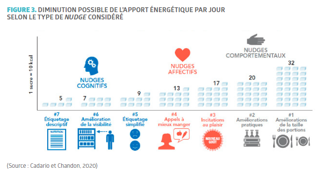 Par ailleurs, l’étude « Which healthy eating nudges work best ? A meta-analysis of field experiments » de P. Chandon et R. Cadario sortie en juin 2020 montre que les nudges cognitifs, dont fait partie le Nutri-score, seraient moins efficaces sur l’apport énergétique que ceux liés à l’affectif (comme des appels à mieux manger ou des incitations au plaisir), et encore bien moins que les nudges comportementaux qui jouent notamment sur l’amélioration des tailles de portions (Cadario et Chandon, 2020 ; figure 3).