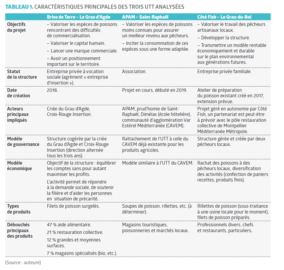 Ces trois initiatives ont pour point commun la volonté de mieux rémunérer les pêcheurs locaux et se démarquent des autres usines de transformation en proposant un prix pour le poisson frais plus élevé que la moyenne, surtout pour les espèces moins populaires, méconnues. Il est intéressant de noter que chacune met l’accent sur un second objectif différent : Brise de Terre au Grau-du-Roi défend une pêche artisanale et durable rentable pour les pêcheurs, Côté Fish au Grau d’Agde apporte lui une dimension plus sociale via l’insertion, tandis que l’APAM de Saint-Raphaël souhaite reconnecter le consommateur avec certaines espèces de poissons oubliées. Le statut de ces structures ainsi que les acteurs impliqués découlent de ces objectifs. Le porteur du projet de Saint-Raphaël étant associatif, le projet est donc multi-acteurs et inclut notamment des acteurs publics qui font le lien avec l’UTT de produits agricoles déjà présente sur le territoire. À l’inverse, au Grau-du-Roi, la mise en place d’une UTT pour les pêcheurs artisans n’a bénéficié que d’un apport financier modéré de la part des pouvoirs publics et l’agrandissement de l’atelier existant se fait entièrement à l’initiative de pêcheurs engagés. La société Brise de Terre du Grau d’Agde, née d’une initiative commune de la Croix-Rouge Insertion et de la criée, souhaite aujourd’hui être suffisamment rentable pour s’émanciper des aides publiques sans pour autant chercher à maximiser ses profits.