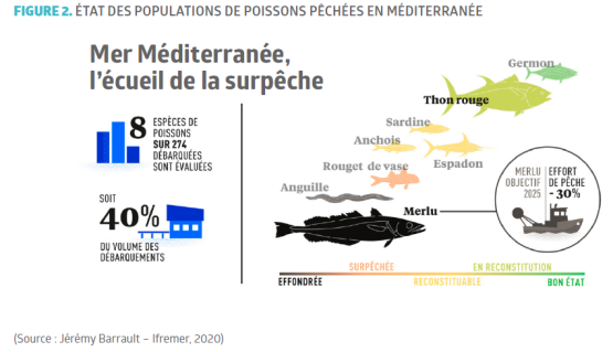 En 2020, 21 % des populations de poissons pêchées évaluées en France sont touchées par la surpêche (Ifremer, 2020). Il faut cependant considérer ce chiffre avec du recul, car il est en effet difficile d’évaluer le statut des stocks réels de poissons du fait, entre autres, du manque de connaissances sur les années d’abondance. Seulement huit populations sont ainsi évaluées sur les deux cent soixante-quatorze pêchées en Méditerranée française.