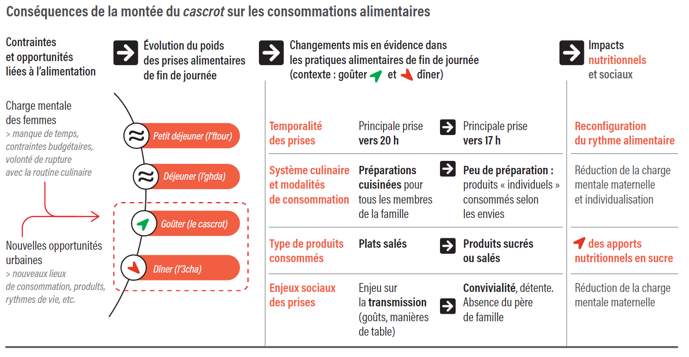 • sur les produits consommés : les plats cuisinés – de plus en plus rares au dîner – sont remplacés au moment du cascrot par une association de produits individuels salés et sucrés, que l’on retrouve en partie au petit-déjeuner. La table du cascrot offre ainsi le choix entre différentes boissons (chaudes ou froides), pains, galettes (les msemen et harcha) et viennoiseries (faites maison ou achetées) ainsi que plusieurs types d’accompagnements comme de la confiture et des fromages industriels (« La Vache qui rit », « Kiri »). Elle peut aussi comporter des produits « de l’extérieur », faits-maison ou achetés (pizza, panini, etc.). Les yaourts, raïb, ou les yaourts à boire sont consommés en collation par les adolescents à l’extérieur de la maison, souvent avec des biscuits. Le cascrot comporte ainsi de nombreux produits roumi (« industrialisés » ou « importés ») ;