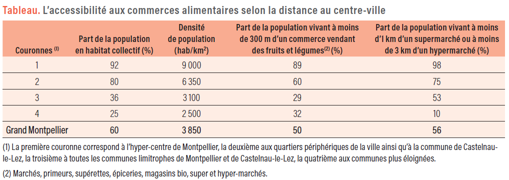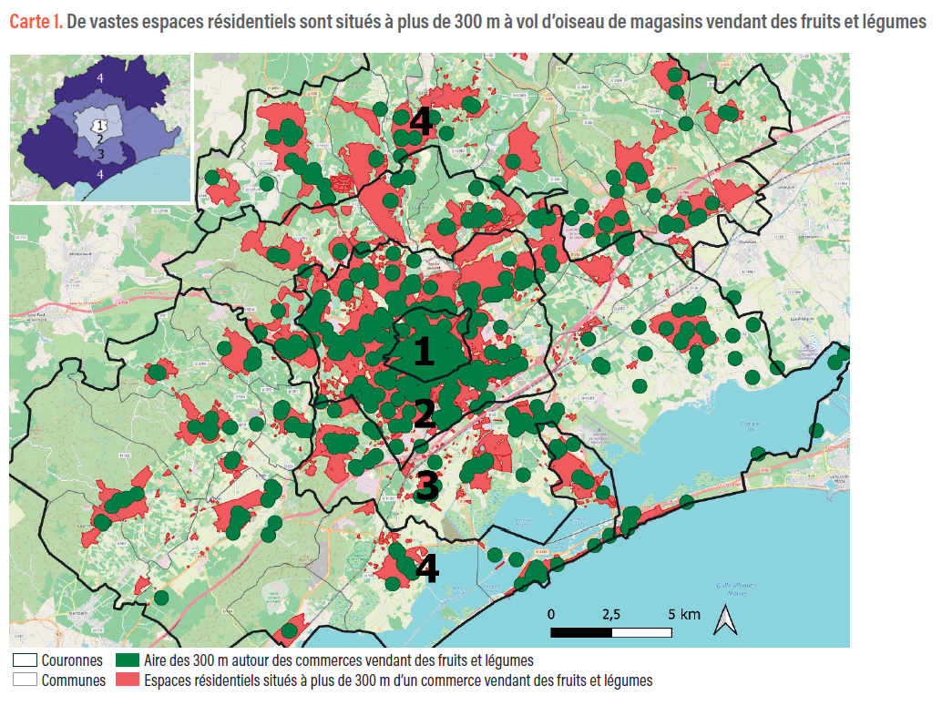 – Dans le Grand Montpellier, on constate de grandes différences d’accès physique aux commerces alimentaires selon la distance au centre-ville. Les communes éloignées sont les moins bien desservies en commerces vendant des fruits et légumes.