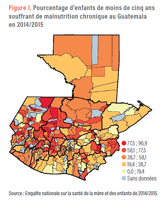 Le pays est classé dans la catégorie des pays à revenu intermédiaire supérieur et son revenu national brut par habitant était de 4 610 dollars US en 2019 [3]. Pourtant, la pauvreté et les inégalités sont encore très persistantes et parmi les plus élevées de la région de l’ALC : 28,8 % de la population vivent dans la pauvreté multidimensionnelle, ce qui représente la proportion la plus élevée en Amérique latine après Haïti. L’un des problèmes les plus préoccupants est le taux très élevé de malnutrition des enfants. Un enfant de moins de cinq ans sur deux est confronté à une condition de malnutrition chronique et 12,6 % sont en insuffisance pondérale. Ces taux sont parmi les plus importants de la région de l’ALC et du monde. Les niveaux les plus élevés sont retrouvés dans les départements de l’ouest du pays, où vit la majeure partie de la population autochtone. Le pourcentage d’enfants de moins de cinq ans souffrant de malnutrition chronique y atteint 60 à 90 % dans certaines municipalités, alors que dans le reste du pays, la part moyenne ne dépasse pas les 40 % (figure 1).