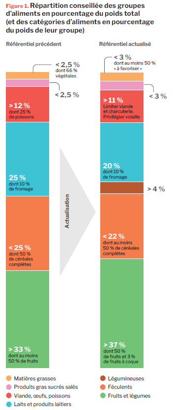 La figure 1 compare la répartition des groupes d’aliments en pourcentage du poids total (et des catégories d’aliments en pourcentage du poids de leur groupe) entre l’ancien et le nouveau référentiel. Dans ce dernier, deux types d’aliments à favoriser font leur entrée : les légumineuses (au moins 4 % du poids total tel que consommé) et les fruits à coques (3 % du poids des fruits et légumes tel que consommé). La catégorie viande hors volaille est à limiter (pas plus de 28 % du poids du groupe viandes, œufs et poissons). On note aussi une légère augmentation de la part des fruits et légumes (au moins 37 %, contre 33 % en 2008) au détriment de celle des produits laitiers (20 %, contre 25 % en 2008). Les pourcentages de produits gras/sucrés/salés et de matières grasses demeurent très minoritaires.