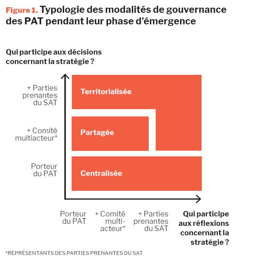 Six types de PAT ont ainsi été identifiés, regroupés en trois tendances (figure 1) : 1) des PAT à gouvernance centralisée, gérés principalement par la structure porteuse ; 2) des PAT à gouvernance partagée, gérés au sein d’un collectif de structures représentantes des opérateur·rice·s du SAT, et 3) des PAT à gouvernance territorialisée, mobilisant directement les opérateur·rice·s du SAT pour leur élaboration.