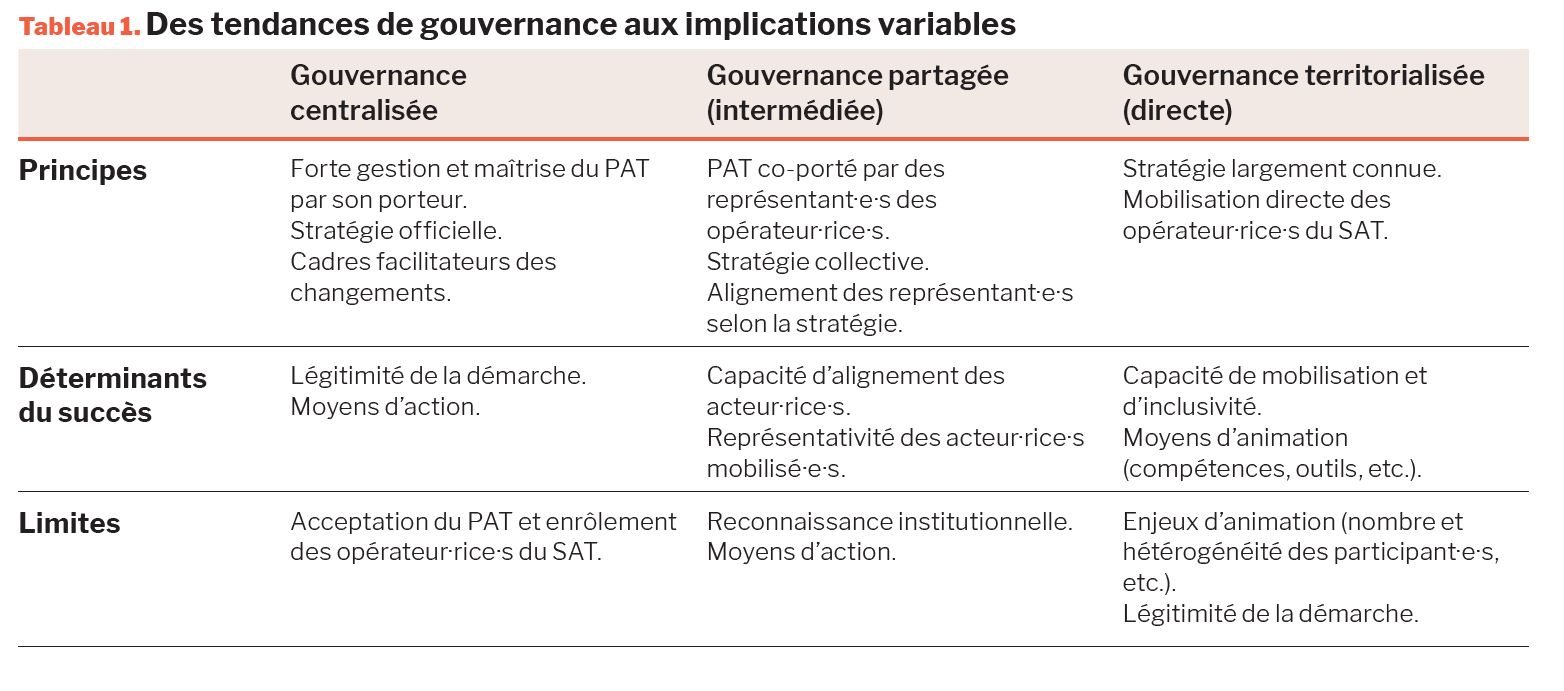 - La gouvernance constitue le principal point d’hétérogénéité entre PAT. Trois tendances se dessinent : une gouvernance centralisée, partagée ou territorialisée. Ces trois tendances complémentaires sont autant de leviers de transition vers des systèmes plus durables.