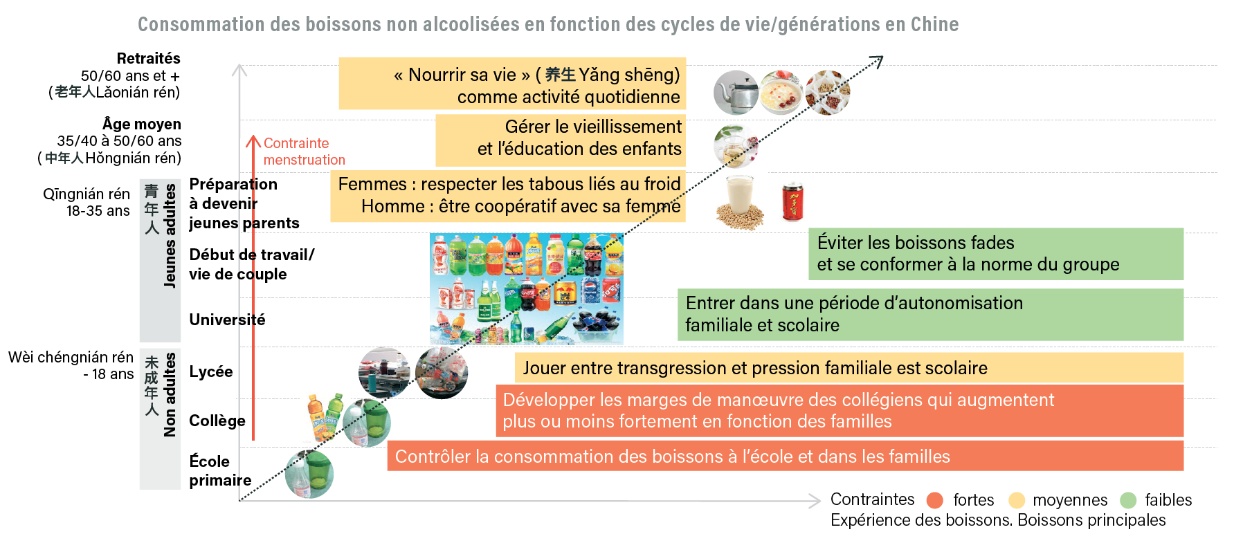 2) pour les jeunes adultes de 18 ans à l’arrivée du premier enfant – entre 25 et 35 ans – (青年人Qīng nián rén : « personne verte, pas mûre »), les normes sociales et les interdits sont beaucoup plus souples. Il est probable que ce cycle de vie se croise avec l’effet de génération, celle qui est née après 1995-2000 et qui a déjà été habituée dans son enfance aux boissons industrielles ;