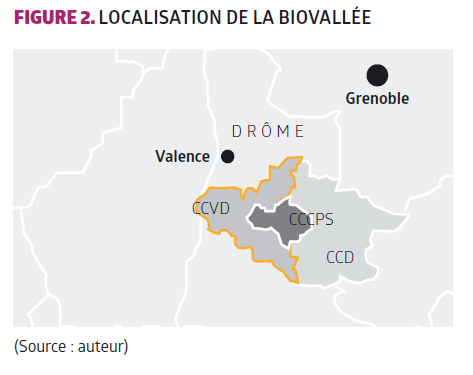 Dans les années 2000, suite au constat de l’efficacité de la stratégie, quatre communautés de communes ont décidé de se regrouper officiellement autour du projet Biovallée. Ce programme ambitieux concerne aujourd’hui la communauté de communes de Val de Drôme (CCVD), celle du pays Diois (CCD) et celle du Crestois et du pays de Saillans (CCDSP), ces deux dernières ayant fusionné depuis 2014 [Figure 2].