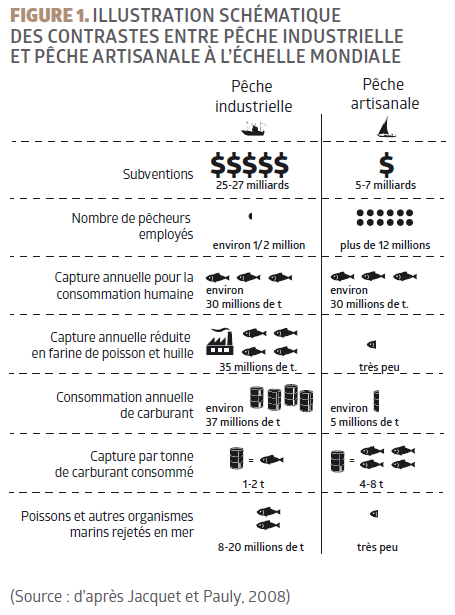 Le développement d’une pêche durable est souvent abordé par rapport à l’enjeu de contenir les excès dévastateurs de la pêche industrielle (Encadré 1). Si la mise en place de mesures pour encadrer la pêche industrielle est cruciale, une approche globale du secteur est indispensable. En premier lieu du fait que les stocks halieutiques sont une ressource partagée par les entreprises de pêche de toutes tailles, mais aussi car la part de la production de pêche marine industrielle dédiée à l’alimentation humaine est équivalente à celle pro-duite par la pêche artisanale : 30 millions de tonnes (Jacquet et Pauly, 2008). Le comparatif réalisé par ces auteurs entre pêche industrielle et petite pêche (Figure 1) soutient l’idée que la clé d’une pêche durable réside dans le rééquilibrage du rapport de force entre pêche industrielle et petite pêche.