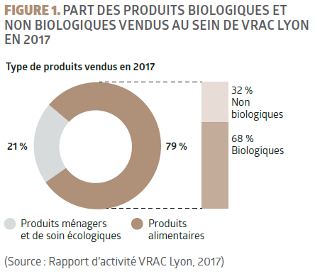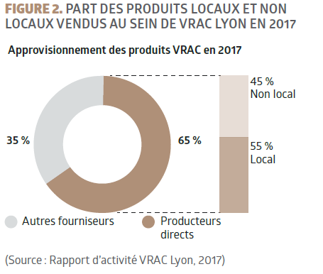 VRAC a l’ambition de permettre aux habitants des quartiers prioritaires de la ville de s’inscrire dans un mode de consommation durable et responsable, en leur proposant chaque mois une centaine de références de produits. On y trouve des produits alimentaires, d’entretien et d’hygiène. Les produits alimentaires sont principalement des produits secs, hormis le pain, le fromage et le beurre. Ils ne répondent pas tous aux critères « biologique » et « local » (Figures 1 et 2). Les produits du catalogue VRAC sont de manière générale, à qualité égale, moins chers que les produits proposés par la grande distribution, mais les prix restent supérieurs aux prix pratiqués par les discounters. L’association est en recherche constante de nouvelles références. Celle-ci passe par un système de veille et de « démarchage » auprès de potentiels fournisseurs. VRAC recueille aussi les propositions de produits à acheter auprès des adhérents.