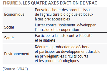 Les personnes en situation de précarité ont difficilement accès aux produits locaux, issus de l’agriculture biologique ou du commerce équitable. Bien souvent, ce n’est pas par manque de sensibilisation mais par manque d’accès géographique et/ou financier. Le projet de l’association Vers un réseau d’achat en commun (VRAC) est de mon-ter des groupements d’achat dans les centres sociaux situés dans des quartiers populaires. L’objectif est de favoriser l’accès du plus grand nombre à des produits de qualité issus de l’agriculture paysanne / biologique / équitable à des prix bas, grâce à la réduction des coûts intermédiaires (circuits courts) et superflus (limitation des emballages).