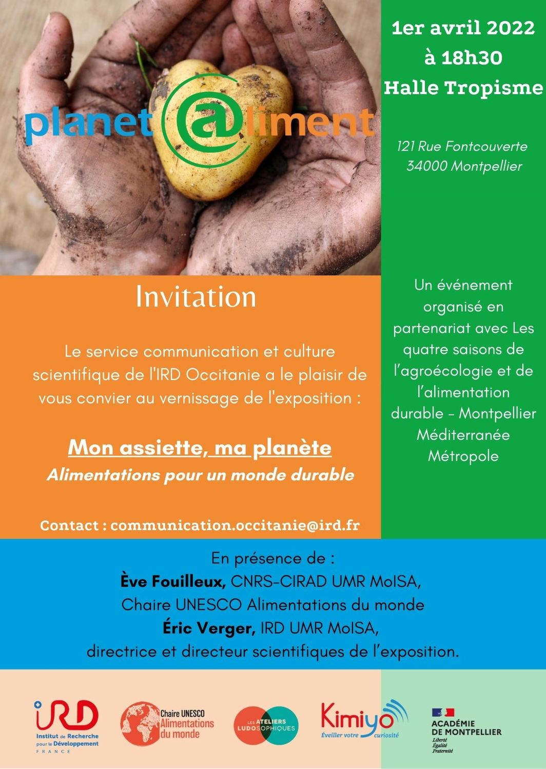 Venez découvrir l’exposition "Mon assiette, ma planète" réalisée dans le cadre du projet Planet@liment coordonné par l’IRD. L’exposition relève le défi de faire le tour des nombreux enjeux de l’alimentation grâce à la participation dans ce projet de chercheurs de disciplines variées de l’INRAE, l’Institut Agro Montpellier, le CIRAD, du CNRS et de l’IRD.