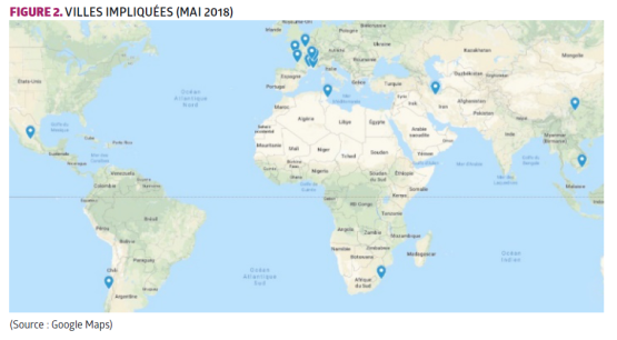 La première année, en cours, est consacrée à la réalisation d’un diagnostic des quatorze villes impliquées pour évaluer la durabilité de leurs systèmes alimentaires [Figure 2]. Ce travail pré-voit l’implication d’étudiants volontaires inscrits dans vingt-six universités situées dans les sept villes françaises. Il s’agit d’étudiants de disciplines variées, telles que les sciences politiques, la géographie, l’urbanisme et l’agronomie, qui contribuent à la conduite d’une étude diagnostic du système alimentaire des villes impliquées, françaises d’abord et étrangères par la suite. Le but est de systématiser des informations sur les systèmes alimentaires locaux, sur les initiatives qui pourraient être reprises par les différentes villes, et de commencer à identifier des aires de collaboration possibles entre les deux villes partenaires.