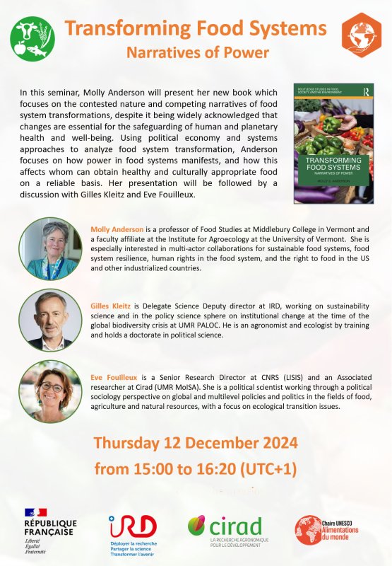 La CoSav Systèmes alimentaires durables, le CTS Systèmes Alimentaires durables du Cirad et la Chaire UNESCO Alimentations du monde, ont organisé un webinaire en anglais sur l’ouvrage de Molly D. Anderson "Transforming Food Systems - Narratives of Power" le 12 décembre dernier.